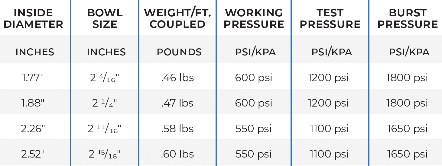 A 3-foot sample of hose chosen at random shall withstand without failure a hydrostatic pressure of 1500 psi while lying straight or curved on a 27” radius for all diameters 21/2” or less. 4” and 5” shall have a minimum burst of 900 psi. Retention of the coupling to the hose shall equal or exceed the burst pressure.