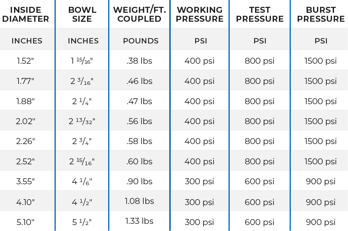 A 3-foot sample of hose chosen at random shall withstand without failure a hydrostatic pressure of 1500 psi while lying straight or curved on a 27” radius for all diameters 21/2” or less. 4” and 5” shall have a minimum burst of 900 psi. Retention of the coupling to the hose shall equal or exceed the burst pressure.