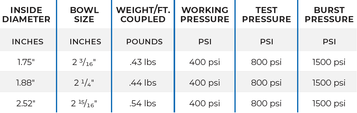The elongation between 10 and 800 psi shall not exceed 8% for the 1½, 1¾”, 2” and 2½” sizes, and shall not exceed 10% for the 3” size.