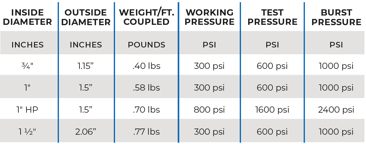 - 800 PSI W/P for 1” HP feature 3:1 working pressure to burst pressure